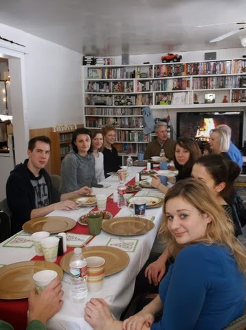 I totally spaced taking pictures of the buffet. Everything was made from scratch. That's just how I cook. Bob made Chili and I made corn bread, chicken /w homemade egg noodles, dinner rolls, ham, mashed sweet potatoes, vegie tray and fruit bowl. There was Apple Pie (Steven's favorite) and Pumpkin Pie (Bob's favorite) for dessert. A simple centerpiece down the length of the seating table consisted of 5 silver trays with homemade turtles and chocolate cheesecake bites - both of which Adrian helped make.